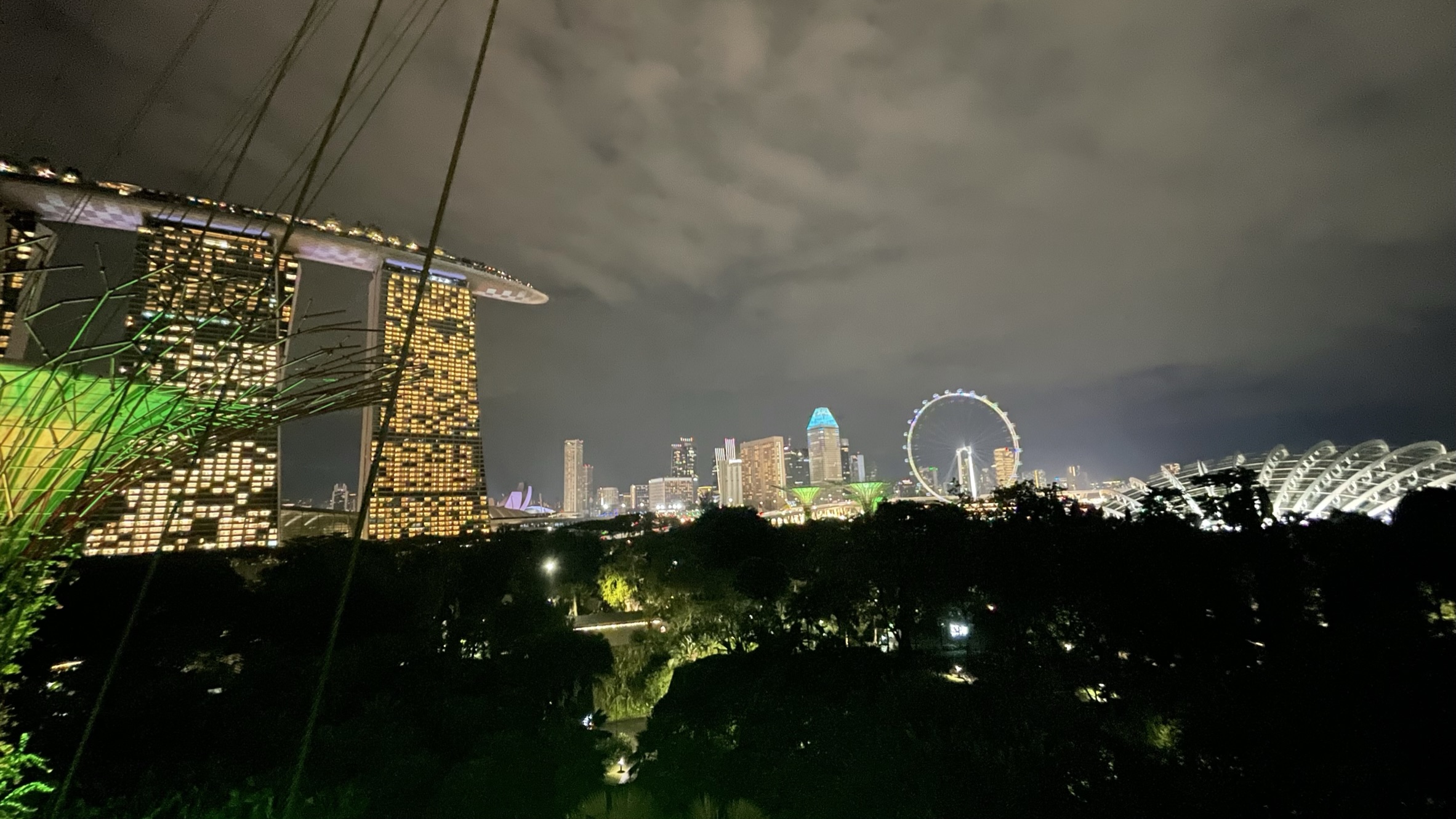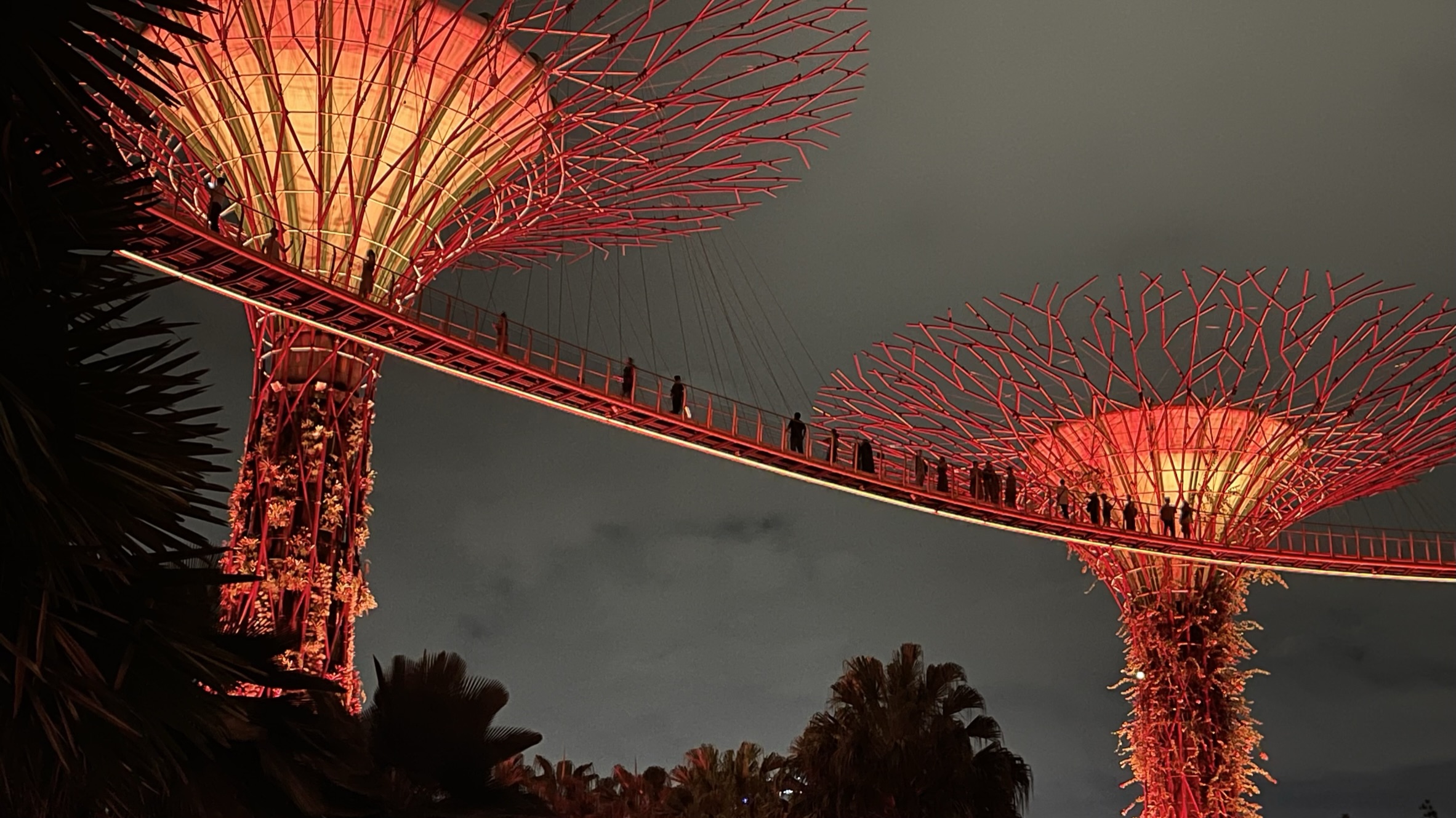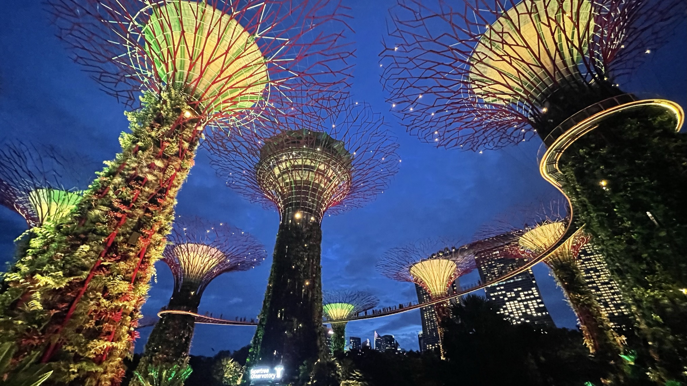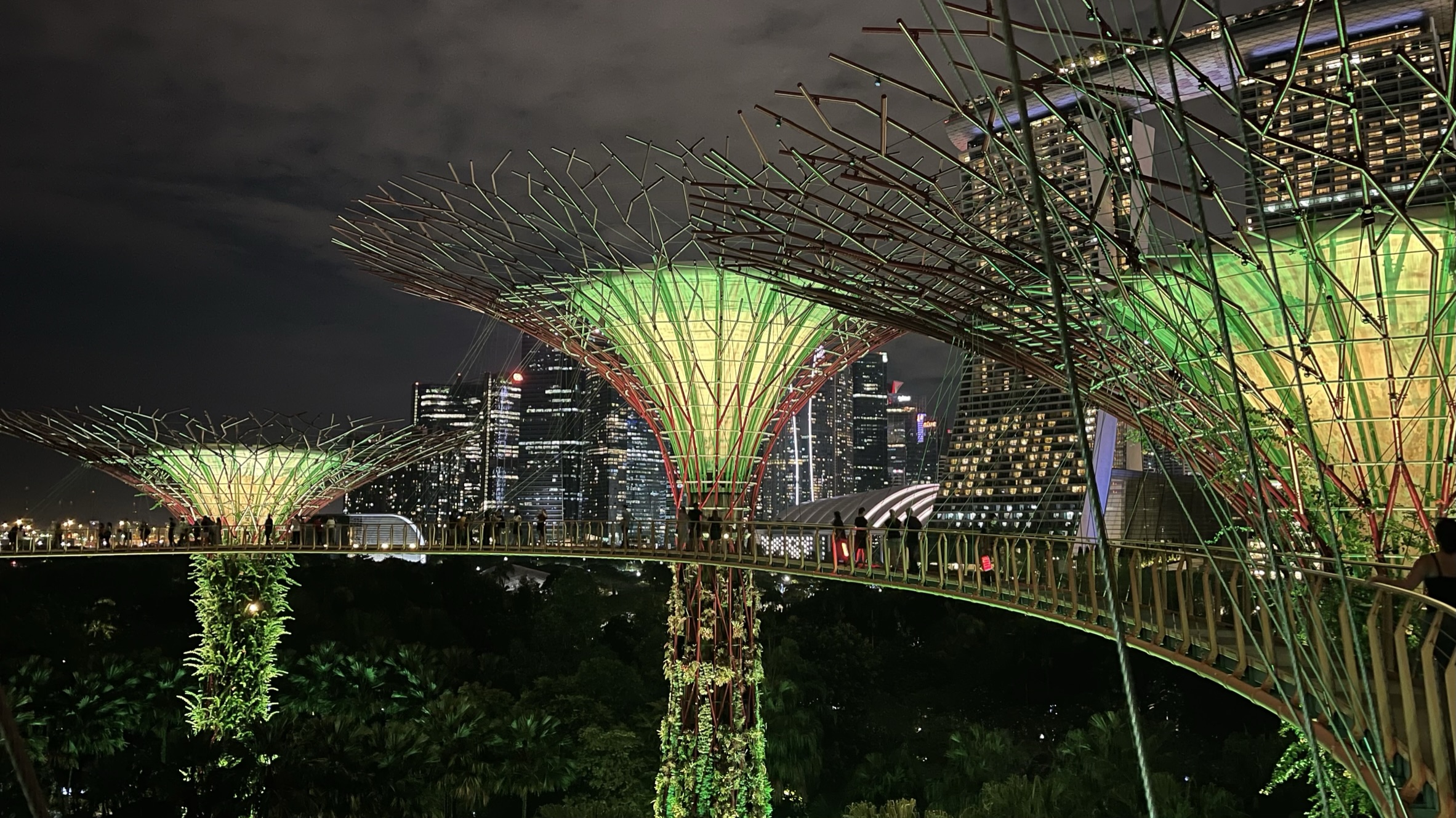 It had stopped raining by early evening so we set out again. This time we were heading for the Gardens by the Bay and the Supertree Observatory. The Supertrees are huge man-made “trees” with a raised walkway running between them. You have to buy tickets for the walkway and some very officious attendants make sure you only get onto the walkway at your allotted time and make sure you keep moving. Despite this we got some great photos of the trees and the Singapore skyline.
